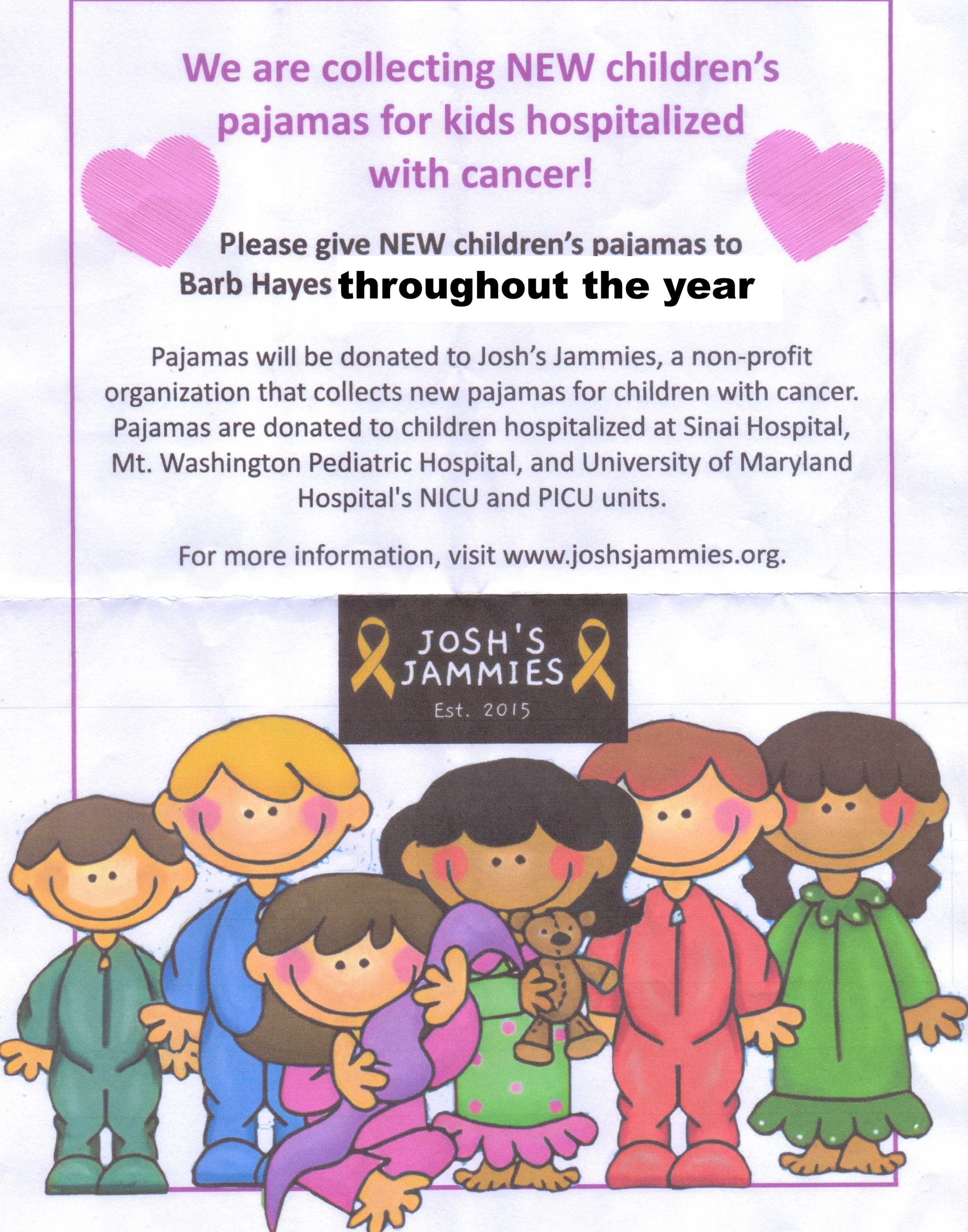 We are collecting NEW children’s pajamas for kids hospitalized with cancer. Pajamas will