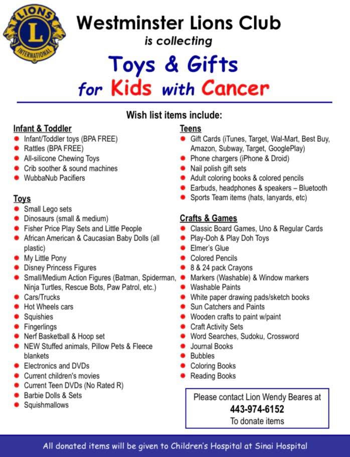 The Westminster Lions Club and Mt. Zion Church are collecting toys and gifts for kids with