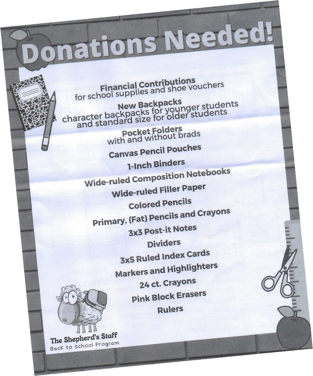 The Shepherd’s Staff is still in need of School supplies: School supplies are STILL needed.