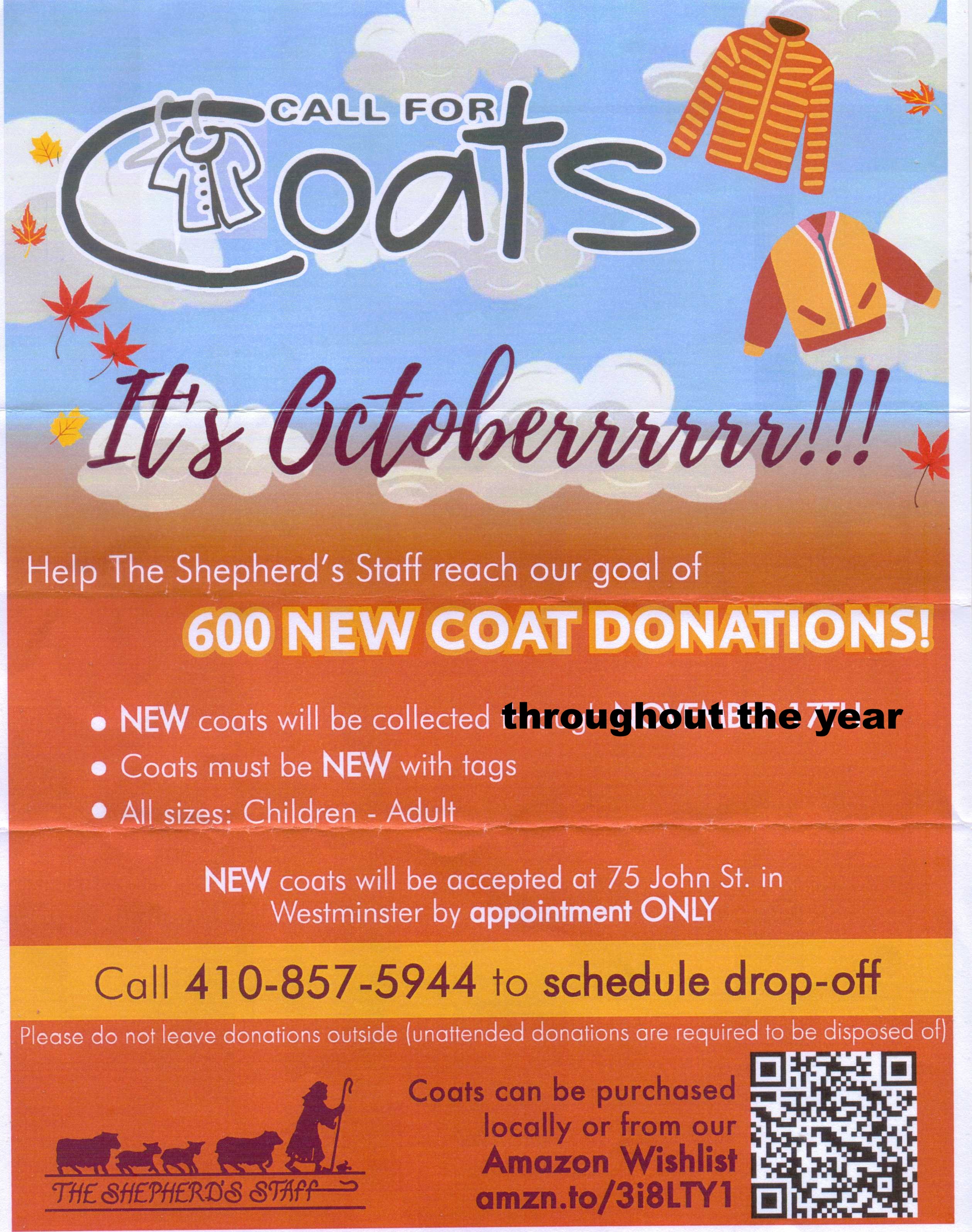 Call for new coats. Help the Shepherd’s Staff reach our goal of 600 New coat donations.