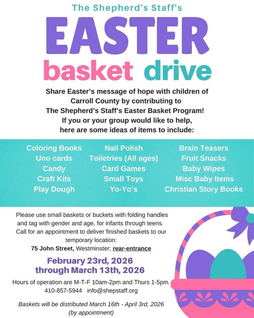 The Shepherd's Staff is having it's Easter Basket Drive through March 13. See flyer for all
